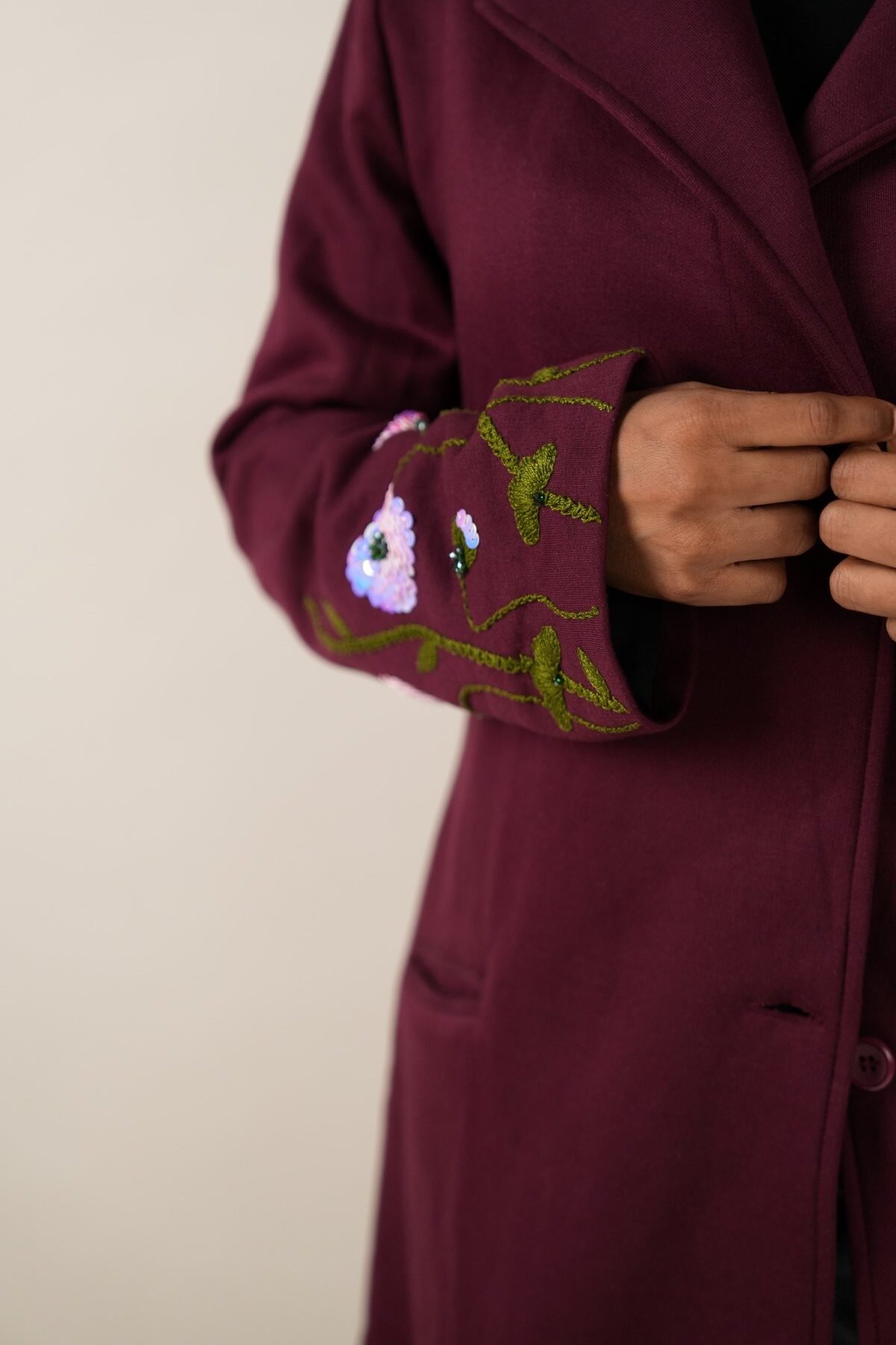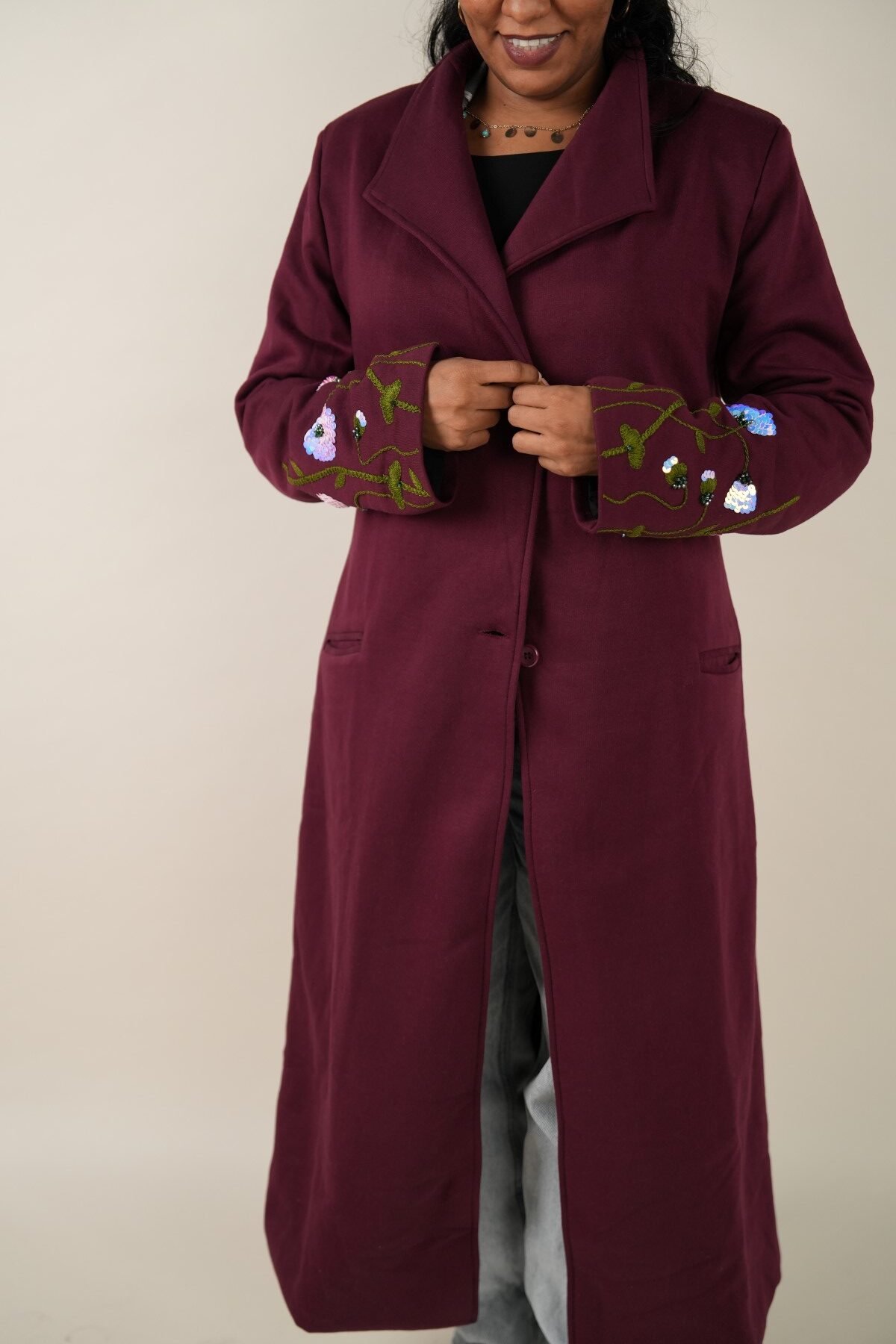 Handmade burgundy coat with a unique one-size design, crafted from premium materials for style and comfort. Perfect for any occasion.